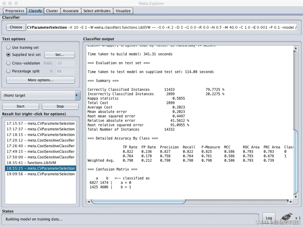 在package manager中下载LibSVM包,并在classifier模块中选择最优参数选择CVParameterSelection,使用SVM分类算法。
