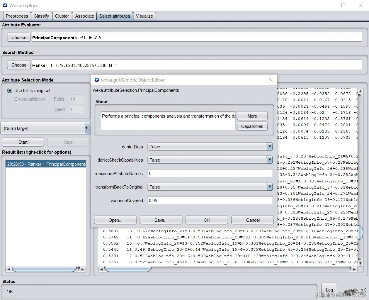 以WeblogInfo降维为例,设置提取5个维度作为主成分,排序后得到第一条属性的个体评价最高达到0.9388,保留第一条属性,导出引入数据集,命名为WeblogInfo。ThirdParty字段同理。