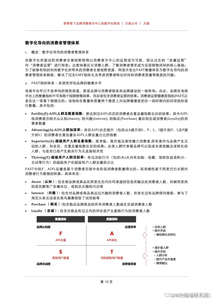 FAST指标主要由四部分构成。分别是消费者资产中的人群总量(Fertility);加深率(Advancing), 也就是消费者历程中从感知,到产生兴趣,再到购买,并成为忠诚用户各个阶段转化率;超级用户数(Superiority),是指对品牌而言具有高净值、高价值及高传播力消费者,如品牌会员等;超级用户活跃度(Thriving)。这四个指标不仅评估消费资产的数量(F和S),也包含消费者资产的质量(A和T)。FAST指标体系能够更加准确的衡量品牌营销运营效率,同时FAST也将品牌运营的视角从一时的输赢(GMV)拉向了对品牌价值健康持久的维护。