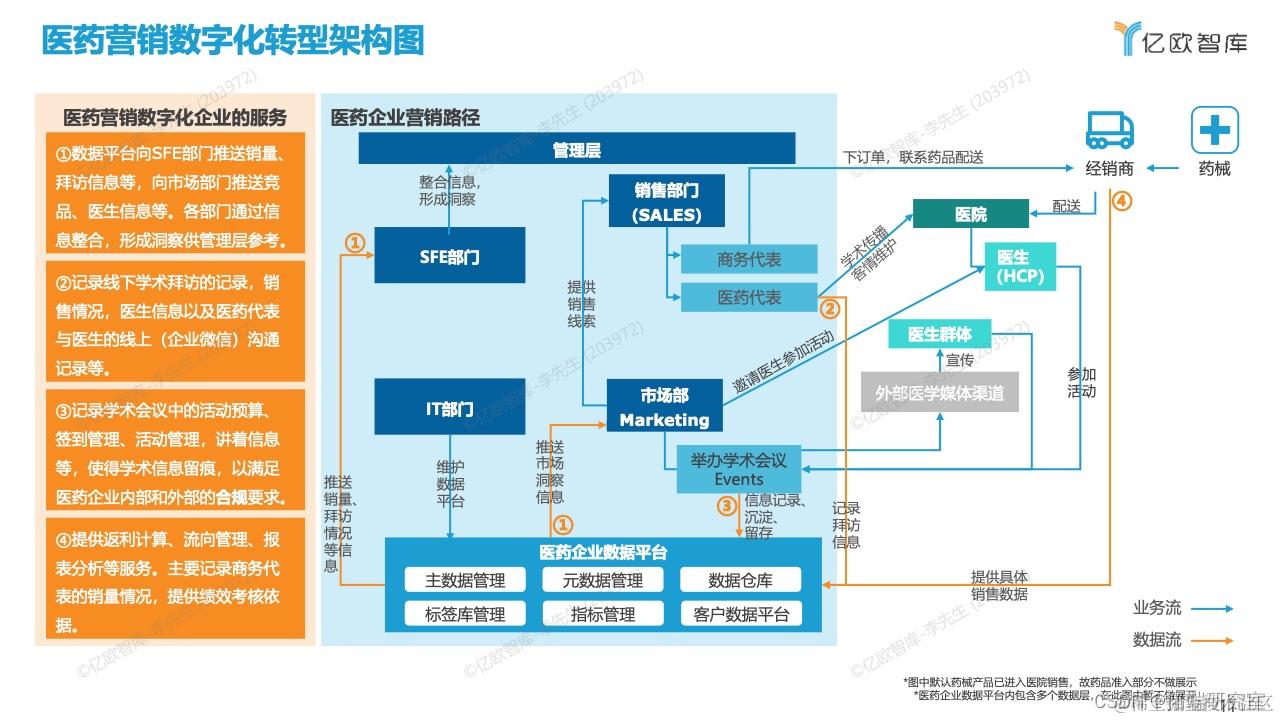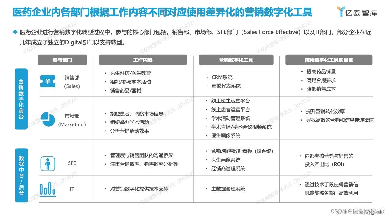 医药企业进行营销数字化转型过程中,参与的核心部门包括,销售部、市场部、SFE部门(Sales Force Effective)以及IT部门,部分企业在近几年成立了独立的Digital部门以支持转型。