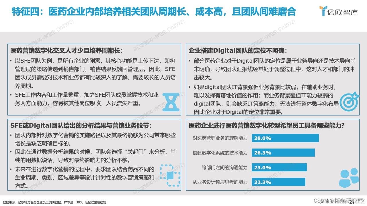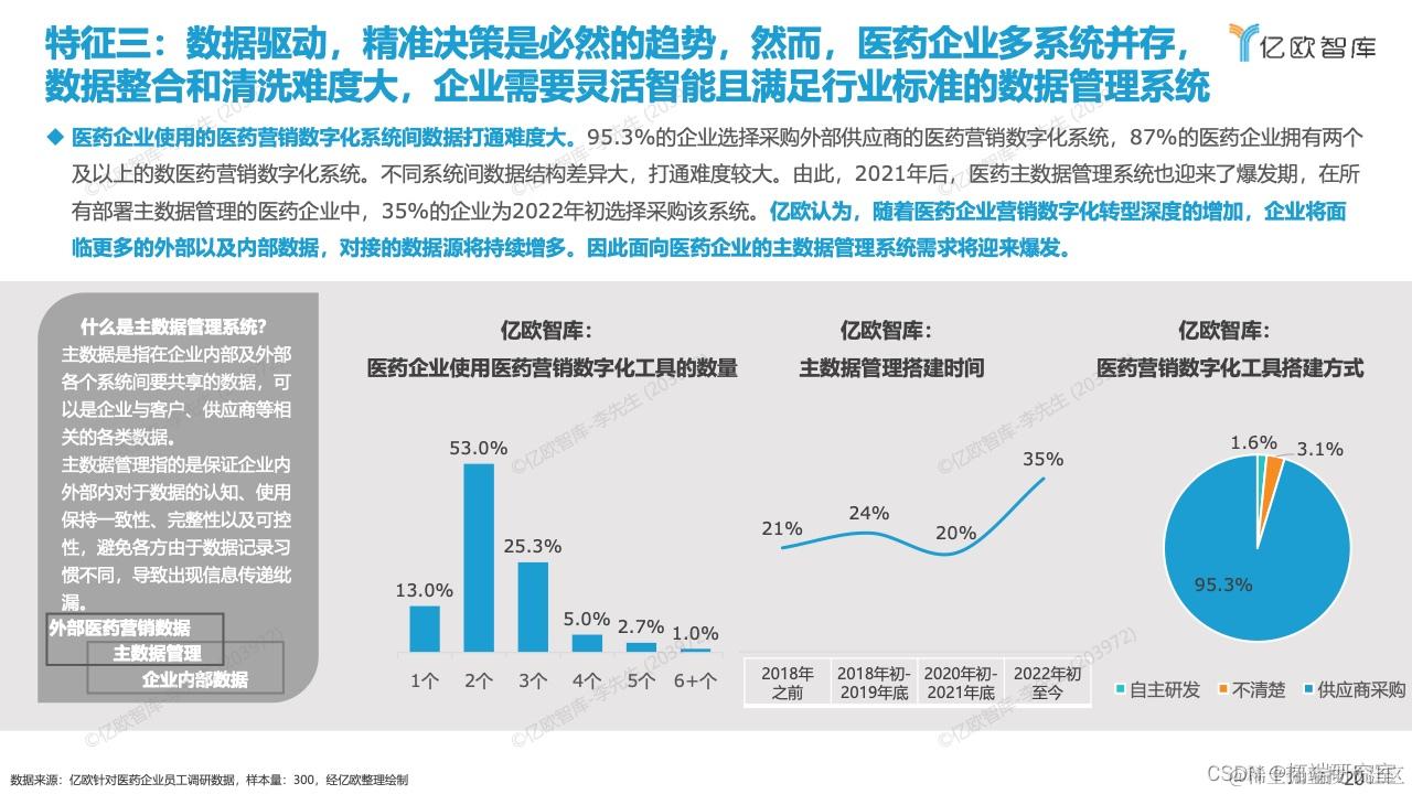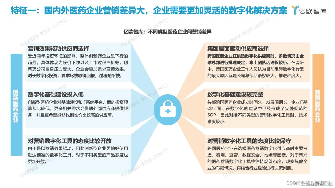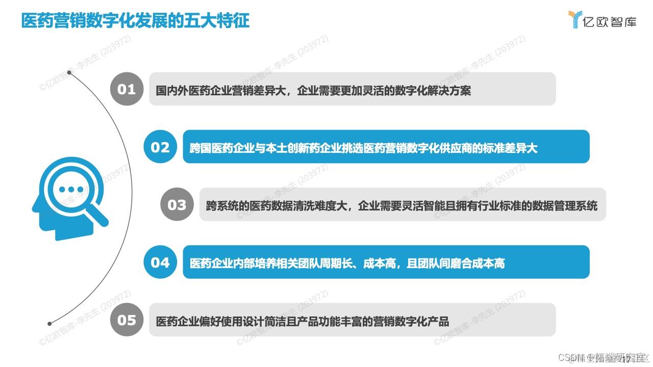 医药营销数字化发展的五大特征,分别为(1)国内外医药企业营销模式和组织架构差异大,企业需要更加灵活的数字化解决方案;(2)跨国医药企业与本土创新药企业挑选医药营销数字化供应商的标准差异大;(3)跨系统间医药数据清洗难度大,企业需要灵活智能的数据管理系统;(4)医药企业内部培养相关团队周期长;(5)团队磨合成本高以及医药企业偏好使用设计简洁且产品功能丰富的营销数字化产品。