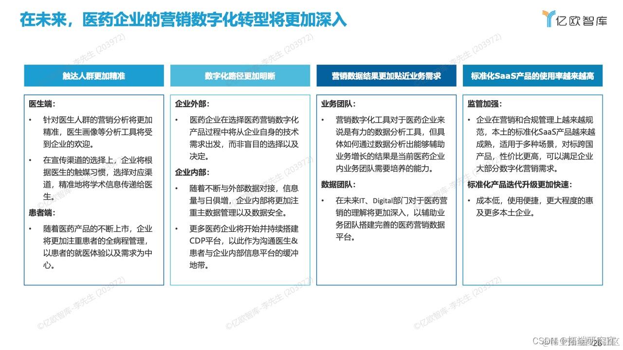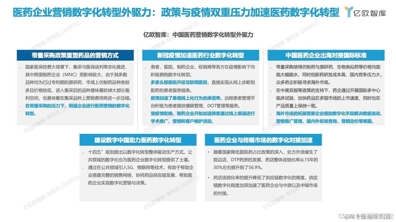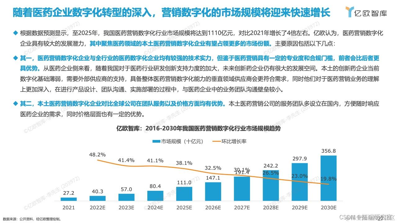 观点三:未来,随着医药企业数字化转型的深入,营销数字化的市场规模将迎来快速增长, 其中聚焦医药领域的本土医药营销数字化企业有望占领更多的市场份额。