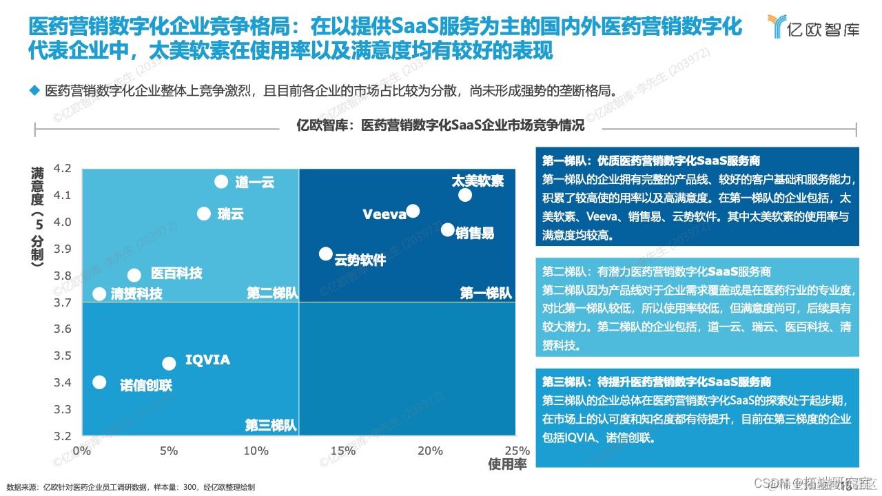 在以提供SaaS服务为主的国内外医药营销数字化代表企业中,太美软素在使用率以及满意度均有较好的表现。
