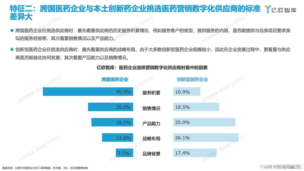 其一,医药营销数字化企业与全行业的医药数字化企业均有较强的技术实力,但前者在医药营销业务的理解上对比后者更具优势。从医药企业侧来看,随着我国对于医药行业研发创新支持力度的加大,未来创新药企业仍有很大的发展空间。本土的创新药企业当前数字化基础薄弱,需要外部供应商的支持,这给整体医药营销数字化企业带来了发展机会。而医药营销数字化企业对比覆盖全行业的数字化企业在对于医药营销业务的理解上更加深入,在进行产品设计、团队沟通、实施部署的过程中,与医药企业中的业务团队沟通壁垒较小。