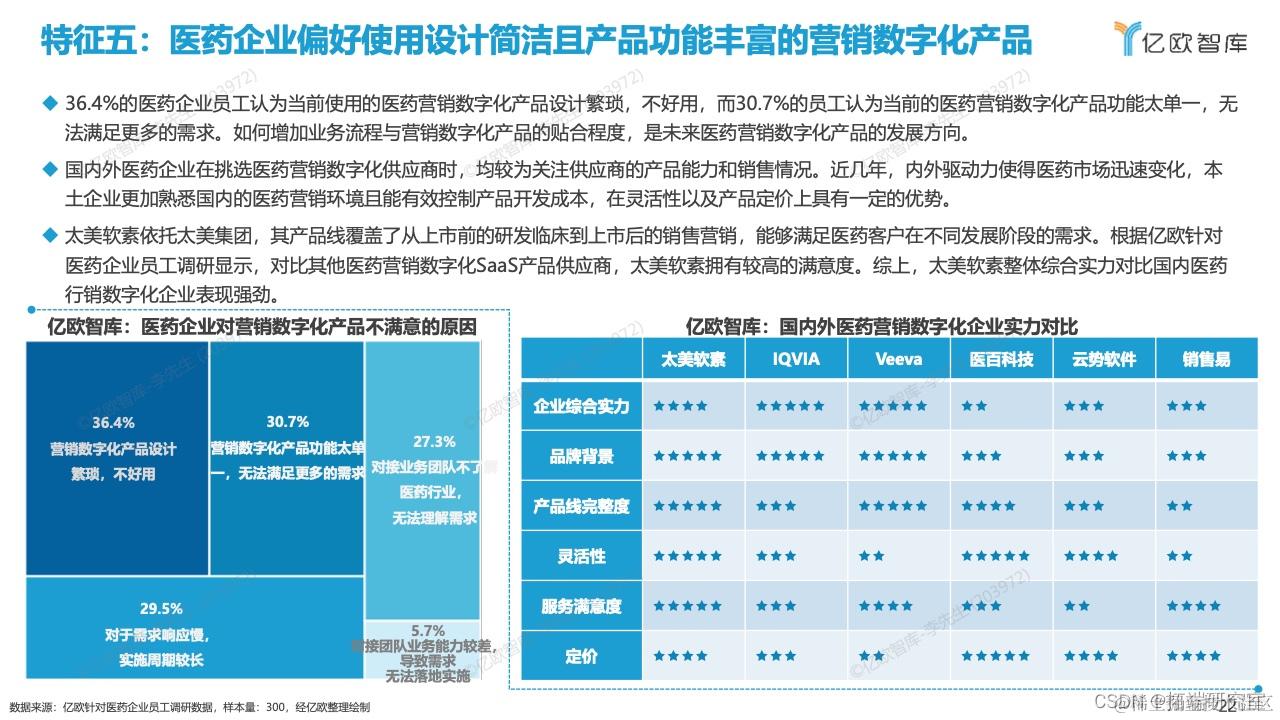 观点二:疫情后主数据管理系统及线上医生运营平台这两个医药营销数字化工具受到企业的欢迎。在提供SaaS服务为主的国内外医药营销数字化代表企业中,第一梯队的企业包括太美软素、Veeva、销售易、云势软件,太美软素在使用率以及满意度均有较好的表现。