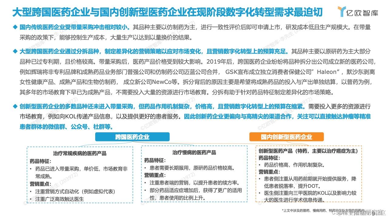 观点一:带量采购与疫情双重压力加速医药数字化转型,医药企业开始追求有限的资源投入以最大限度提升营销效果,医药营销数字化已经来到了效果为王的阶段。其中,大型跨国医药企业与创新型医药企业在现阶段数字化转型需求最为迫切。