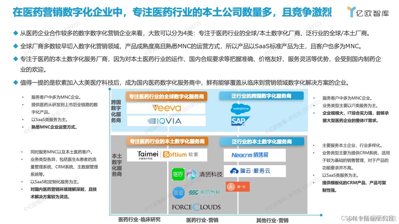 与医药企业合作较多的数字数字化营销企业大致可以分为4类:专注于医药行业的全球/本土数字化厂商、泛行业的全球/本土厂商。