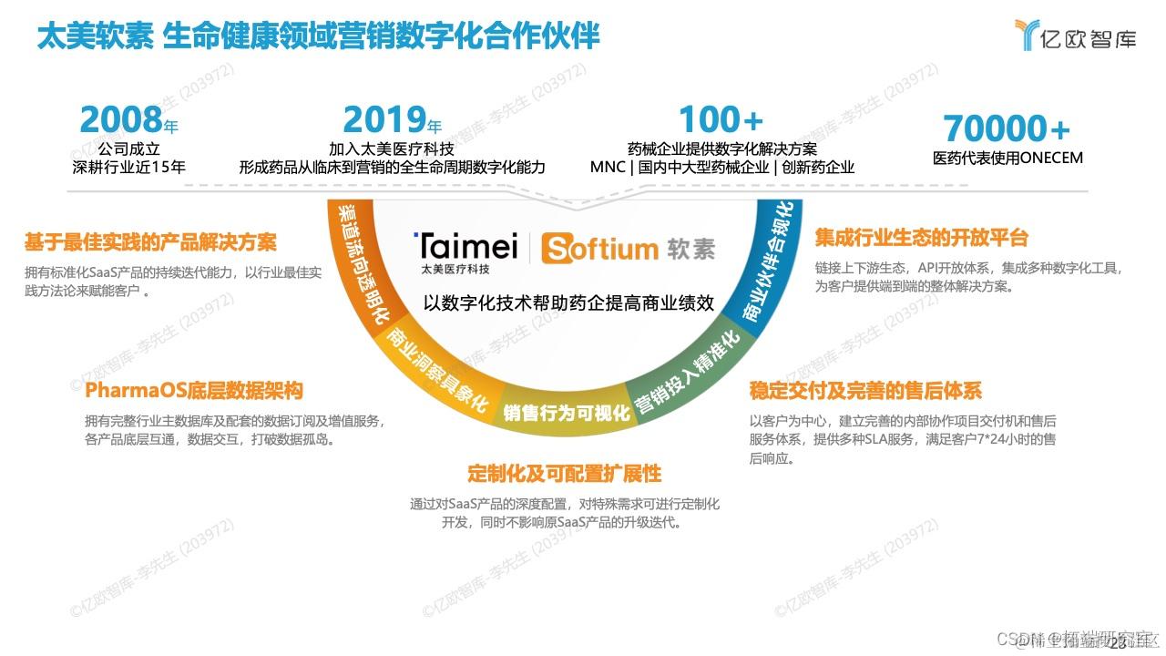 在诸多医药营销数字化厂商中,专注于医药行业的本土厂商,以其高度灵活性、快速服务响应,优良的性价比受到越来越多药企的欢迎,太美软素是非常具有代表性的一家公司,特别是加入太美医疗科技之后,整体研发创新和医药研发到销售数字化全链路打通上使其实力倍增,具备了跟国外厂商对标的能力。太美软素围绕中国药械企业的营销创利全流程,自主研发ONECEM、ONEInsight数字化营销产品和服务组合,太美软素OneCEM通过线上+线下多渠道触达医生,打造全渠道数字营销协同平台,提供社交化CRM协同工具,多渠道互动工具,如会议直播,病例征集,真实有效增强企业和医生的互动频率,实现私域运营。OneInsight整合企业内外部大数据, 以及医生与代表日常的互动行为,形成医生360画像、为医生智能推荐更有价值的内容,提升医生的学术影响力。