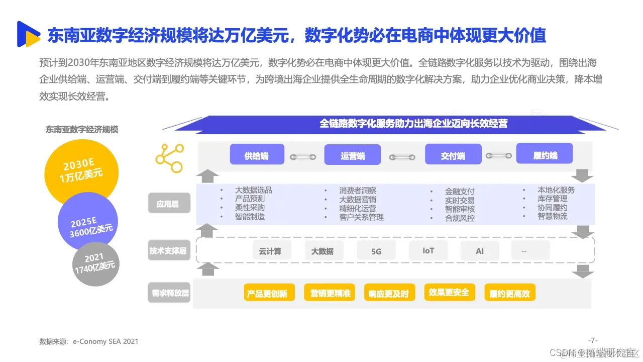 近年,在RECP协议加持以及科技水平不断发展、外贸转型升级等种种因素驱动之下,东南亚这个潜力巨大的广阔市场吸引了中国乃至全球的眼光,成为全球电子商务发展增速最快的地区之一,并被称之为数字经济的下一个前沿区域。上述报告预计,到2030年东南亚地区数字经济规模将达万亿美元。