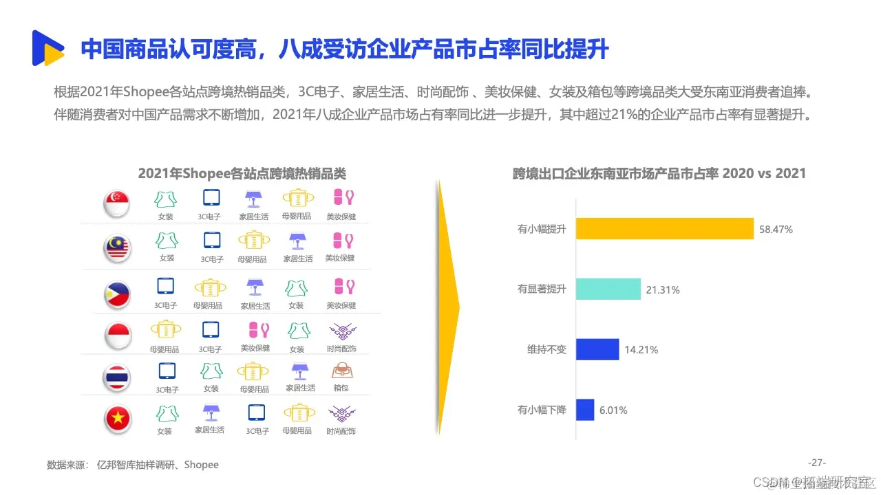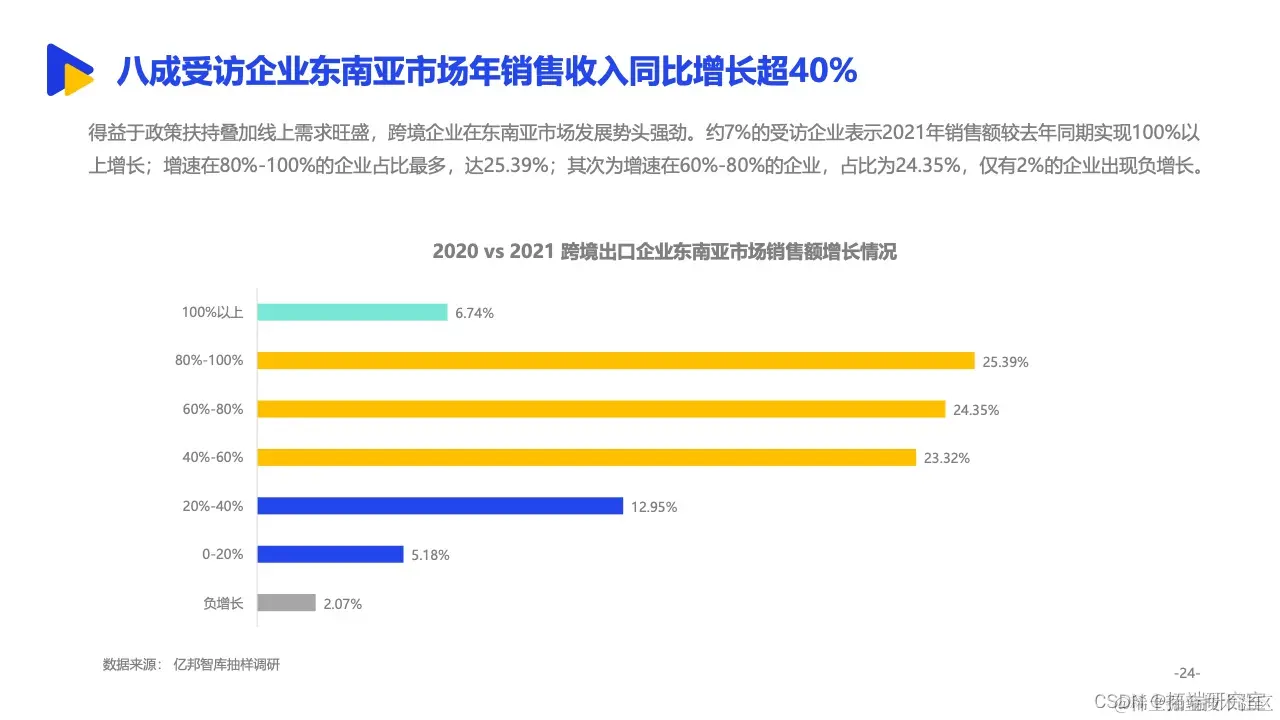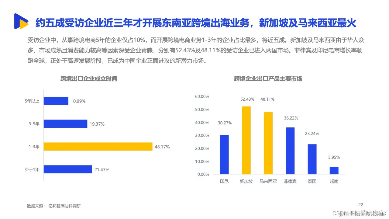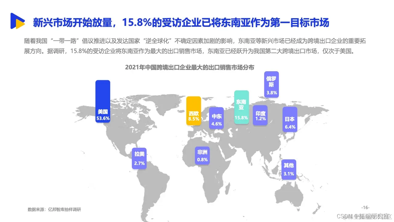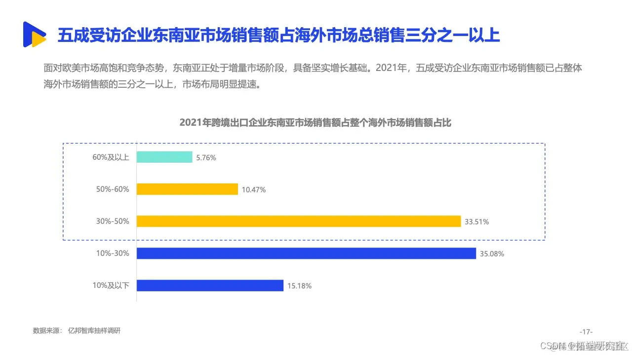 其中,依托与中国相似的经济形态、临近的地理位置等背景,东南亚更是成为诸多中国跨境出口企业的重要拓展方向。来自亿邦智库的调研报告显示,有15.8%的受访企业将东南亚作为最大的出口销售市场,东南亚已经跃升为我国第二大跨境出口市场。同时,面对欧美市场高饱和竞争态势,东南亚正处于增量市场阶段,具备坚实增长基础。2021年,五成受访企业东南亚市场的销售额已占整体海外市场三分之一以上,市场布局明显提速。