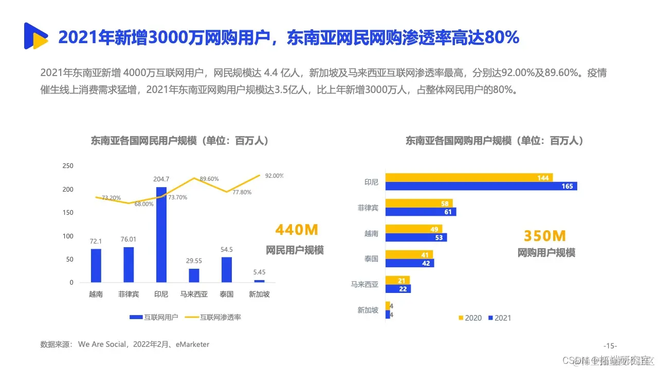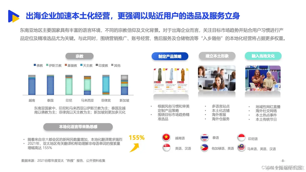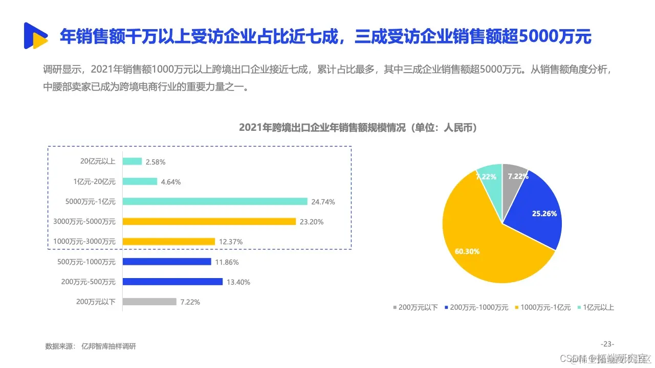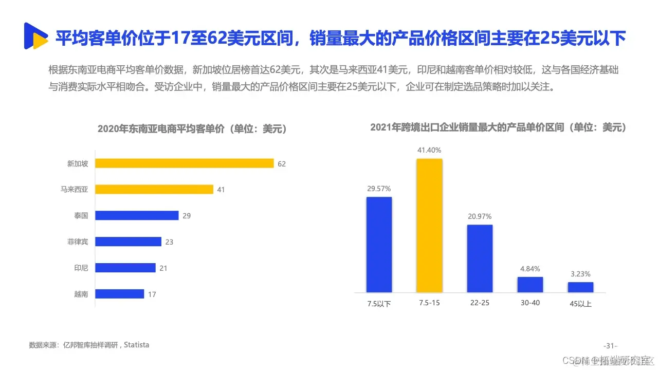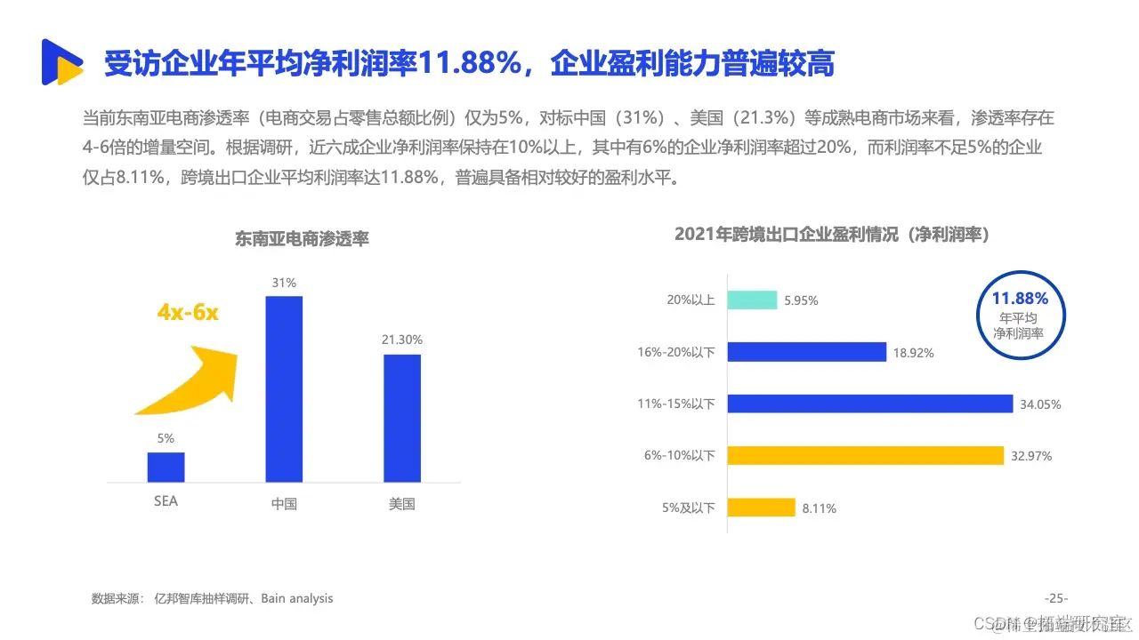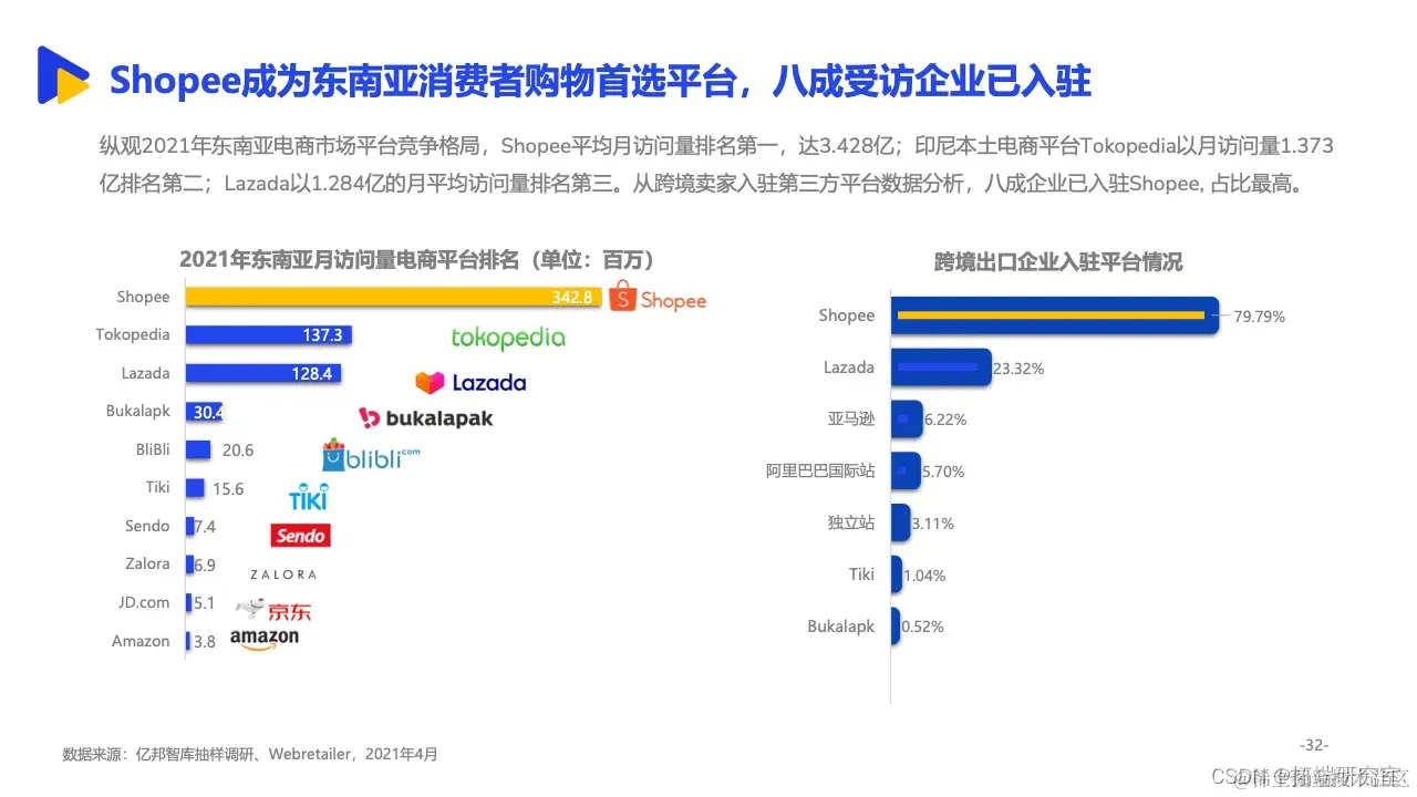 其中,依托与中国相似的经济形态、临近的地理位置等背景,东南亚更是成为诸多中国跨境出口企业的重要拓展方向。来自亿邦智库的调研报告显示,有15.8%的受访企业将东南亚作为最大的出口销售市场,东南亚已经跃升为我国第二大跨境出口市场。同时,面对欧美市场高饱和竞争态势,东南亚正处于增量市场阶段,具备坚实增长基础。2021年,五成受访企业东南亚市场的销售额已占整体海外市场三分之一以上,市场布局明显提速。