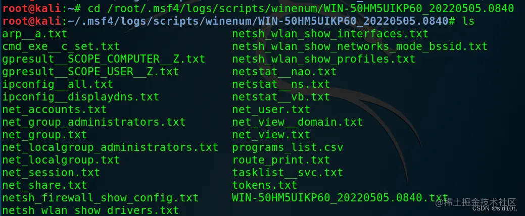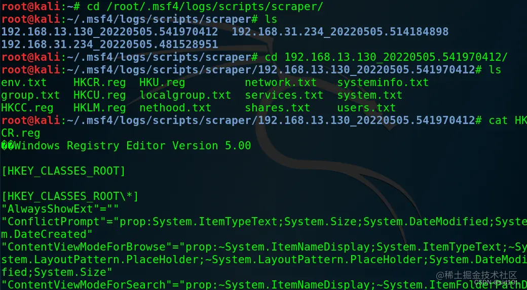 /root/.msf4/logs/scripts/scraper 目录下。使用 ls 命令查看存储的这些文件。