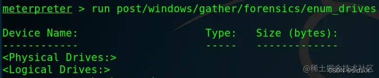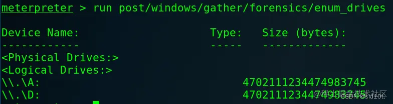 1、获取目标机器的分区情况:post/windows/gather/forensics/enum_drives