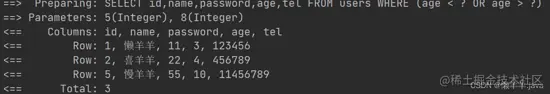 SELECT id,name,password,age,tel FROM user WHERE (age < ?)