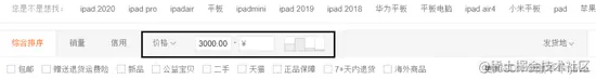 以TB为例,我们购物时进行条件筛选时, 可以选择单条件,也可以选择多条件 ,如上,我的条件就变成price>3000,price<null,这种情况按照以上介绍的查询的方式就会出现问题,如图: