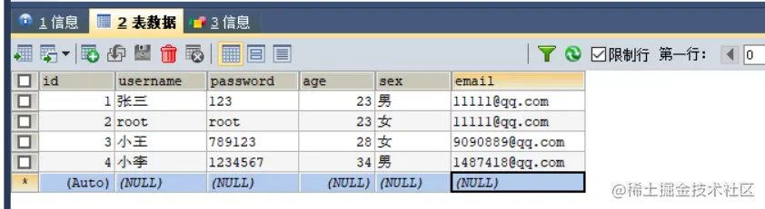 3={password=789123, sex=女, id=3, age=28, email=9090889@qq.com, username=小王}, 4={password=1234567, sex=男, id=4, age=34, email=1487418@qq.com, username=小李}}