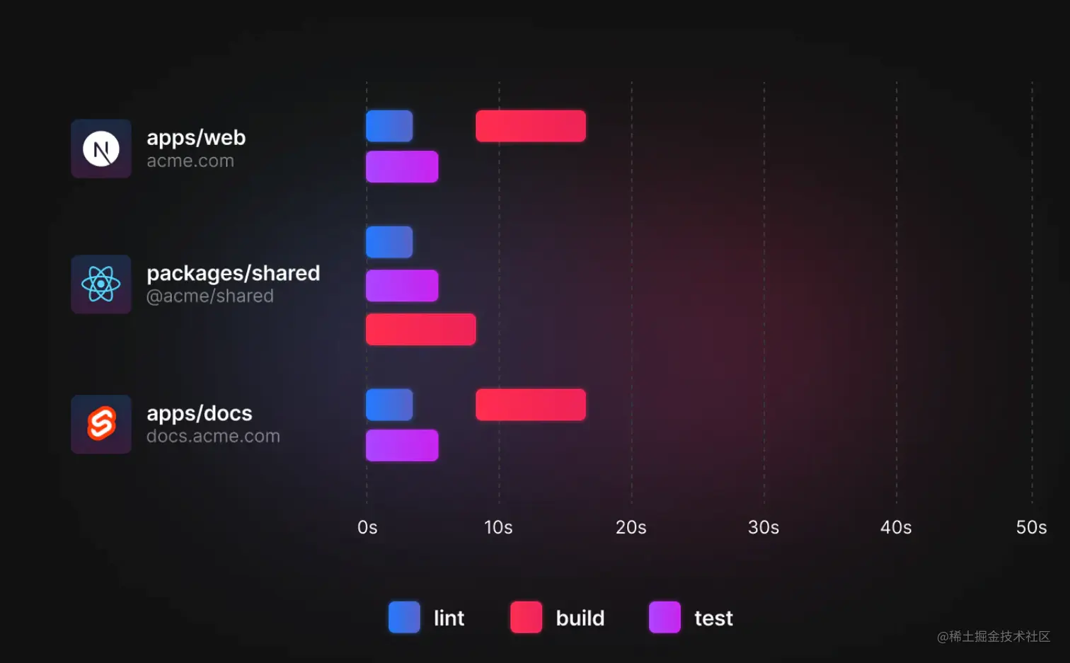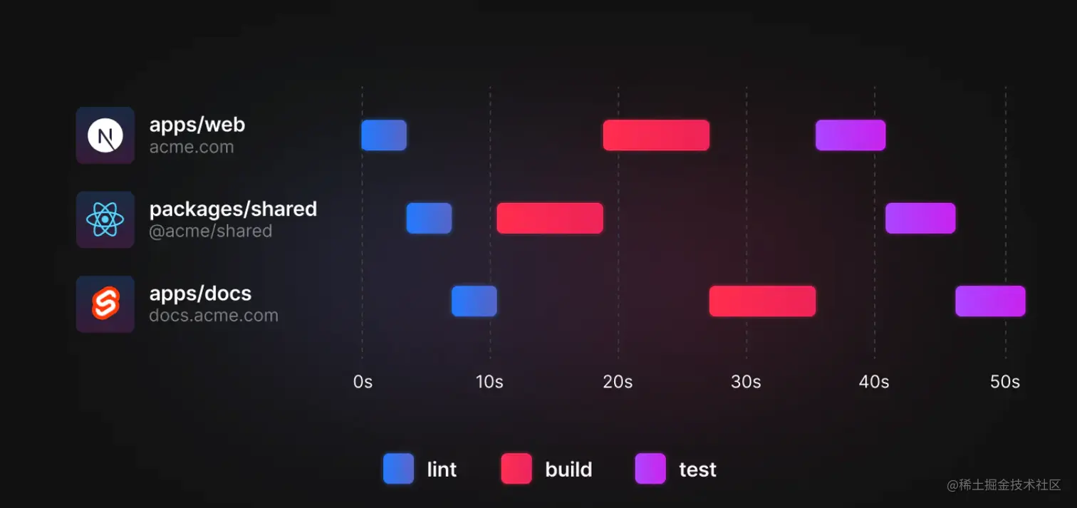 总的来说,Turborepo 通过这种配置方式来声明 task 之间的关系,除了在运行性能有不错的提升之外,开发者也可以从配置中了解到工作流之间的依赖关系。