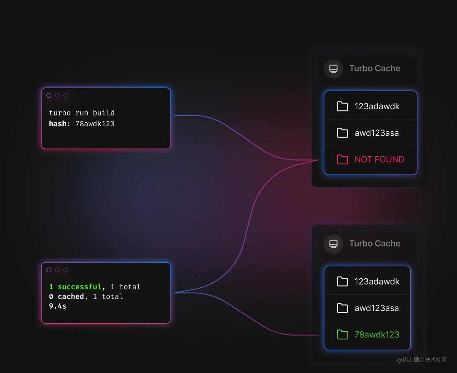 如图所示,当前 build hash 如果在 turbo 缓存目录下存在,则表示缓存命中。
