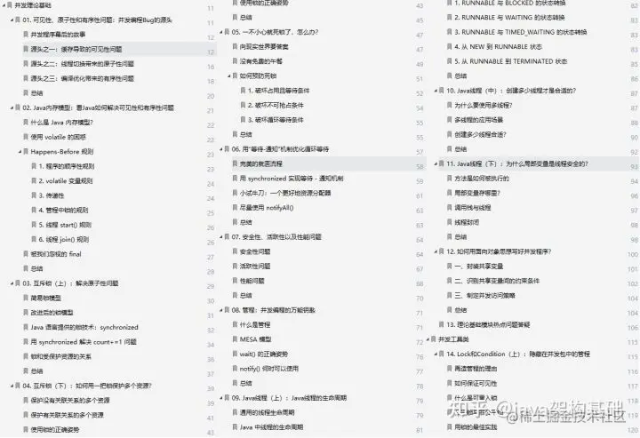 (内容涵盖:并发编程Bug的源头+Java内存模型+互斥锁+死锁+用“等待-通知”机制优化循环等待+安全性、活跃性以及性能问题+并发编程的万能钥匙+Java线程+如何写好并发程序)