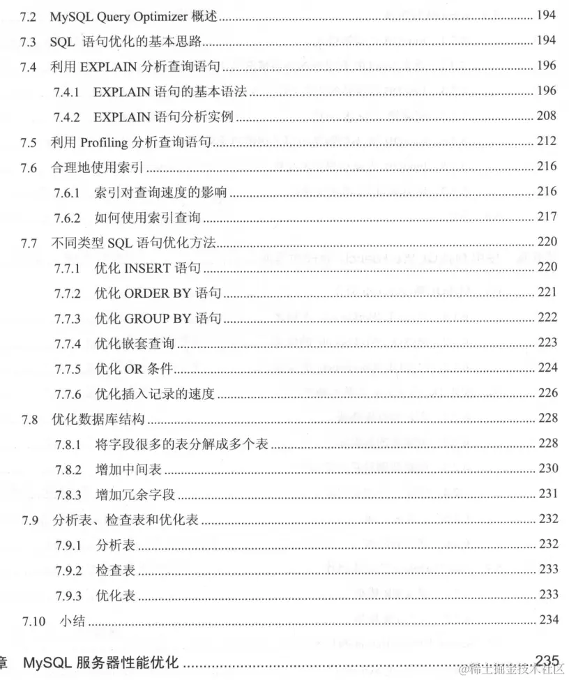 第7章介绍SQL性能优化。包括优化简介、MySQL Query Optimizer概述、SQL语句优化的基本思路、利用EXPLAIN分析查询语句、利用Profiling分析查询语句、合理地使用索引不同类型SQL语句优化方法、优化数据库结构、分析表、检查表和优化表。