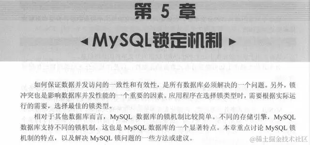 第5章介绍MySQL锁定机制。包括MySQL锁定机制的概述MyISAM表级锁和InnoDB行级锁。