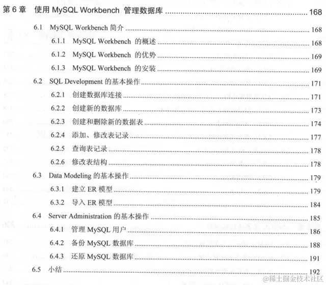 第6章介绍使用MySQL Workbench 管理数据库。包括MySQL Workbench 简介、SQL Development的基本操作、Data Modeling的基本操作、Server Administration的基本操作。