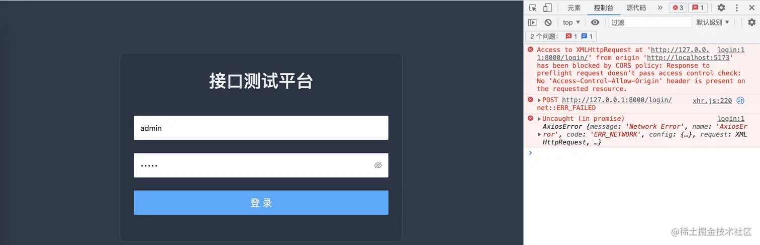 再次启动项目,输入用户名和密码,打开开发者工具,点击【登录】按钮后可以看到接口正常请求了,但是报错了,"CORS"跨域请求。