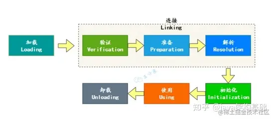 一个类从被加载到虚拟机内存中开始,到从内存中卸载,整个生命周期需要经过七个阶段:加载 (Loading)、验证(Verification)、准备(Preparation)、解析(Resolution)、初始化 (Initialization)、使用(Using)和卸载(Unloading),其中验证、准备、解析三个部分统称为连接(Linking)。