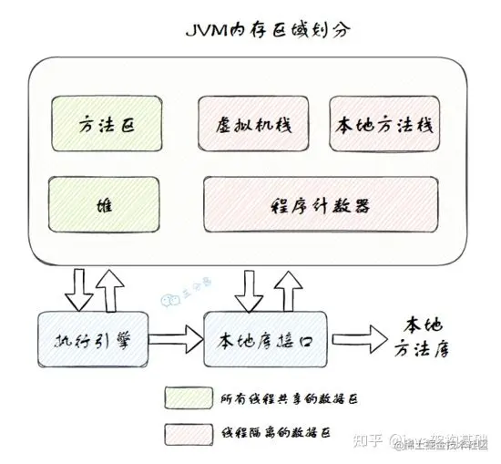 JVM内存分为线程私有区和线程共享区,其中 方法区 和 堆 是线程共享区, 虚拟机栈 、 本地方法栈 和 程序计数器 是线程隔离的数据区。