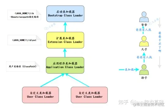 - 用户自定义类加载器(user class loader),用户通过继承 java.lang.ClassLoader类的方式自行实现的类加载器。