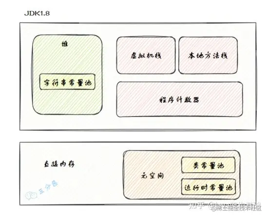 - 在JDK1.8时彻底干掉了永久代,而在直接内存中划出一块区域作为 元空间 ,运行时常量池、类常量池都移动到元空间。\