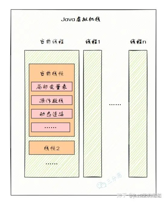 Java虚拟机栈描述的是Java方法执行的线程内存模型:方法执行时,JVM会同步创建一个栈帧,用来存储局部变量表、操作数栈、动态连接等。