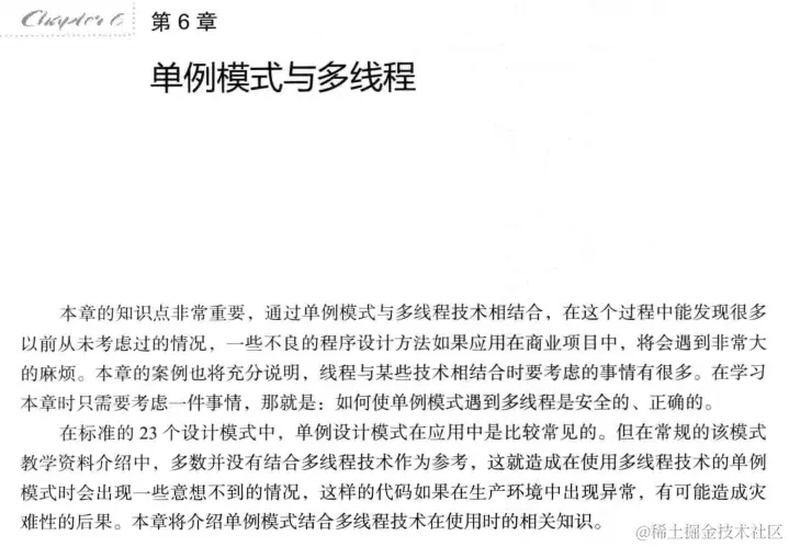 本章使用若干案例来阐述单例模式与多线程结合时遇到的情况与解决方法。本章也复习了不同单例模式的使用,使得以后再遇到单例模式时,就能从容面对多线程环境的情况了。