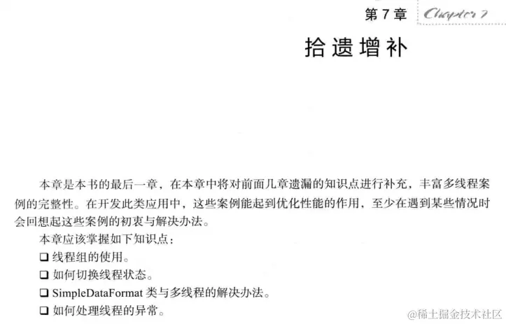 本章弥补了前面几个章节遗漏的技术空白点,这些示例是对多线程技术学习的补充,有助于更细化地理解多线程的细节。比如,理解线程的状态后,完全可以对不同状态下的线程正在做哪些事情了如指掌;学习了线程组后可以对线程的组织实施更有效的规划;SimpleDateFormat类在遇到多线程时也会出现意想不到的异常。最后学习了线程在出现异常时的常用处理方式。