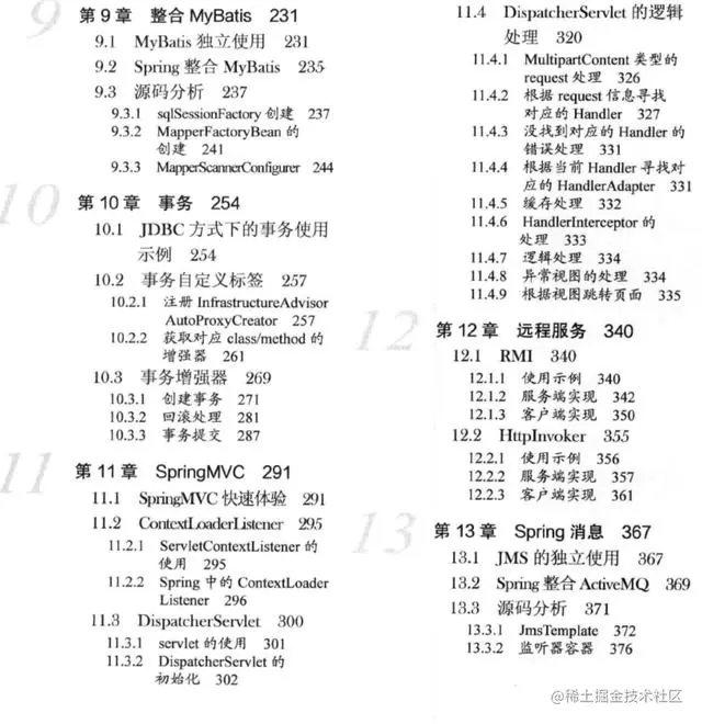 第二部分企业应用(第8~13章): 在核心实现部分的基础上围绕企业应用常用的模块进行讨论,这些模块包括Spring整合JDBC. Spring 整合MyBatis、 事务、SpringMVC、远程服务、Spring 消息服务等,旨在帮助读者在日常开发中更加高效地使用Spring。