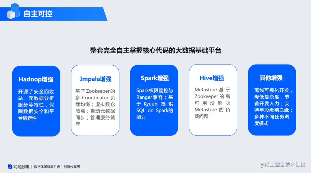 有数大数据基础平台NDH原本作为网易数帆数据中台的底座提供,因市场需求,于今年6月作为单独的产品发布,此举也曾引发业界热议——网易数帆为何进军这门“不好的生意”。然而,这款产品在Impala和Kyuubi方面的积累和优势让从业者印象深刻。目前,有数大数据基础平台NDH已应用于银行、证券、流通、制造等行业三百多家企业客户生产环境。