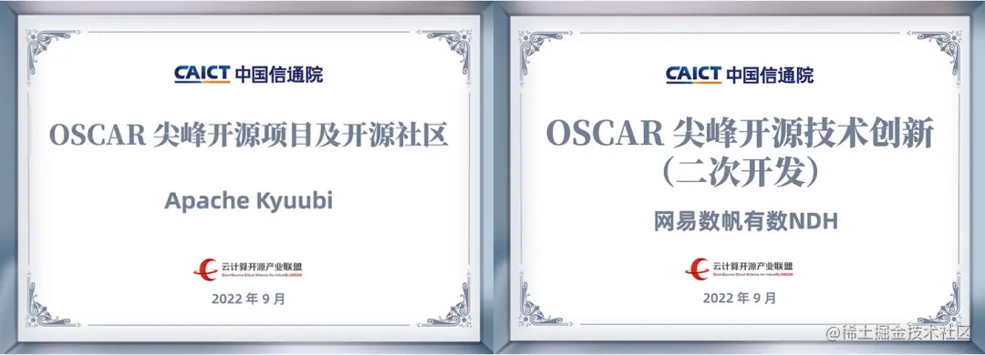 在9月16日召开的**“2022 OSCAR开源产业大会”上,中国信息通信研究院发布了一系列开源研究成果和开源表彰,网易数帆发起的开源项目Apache Kyuubi**荣获“OSCAR尖峰开源项目及开源社区”,有数大数据基础平台NDH荣获“OSCAR尖峰开源技术创新(二次开发)”。