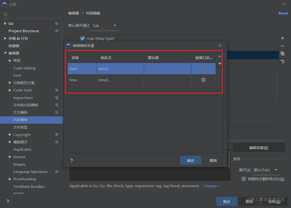 - File->Settings->Editor->Live Templates 打开如下对话框