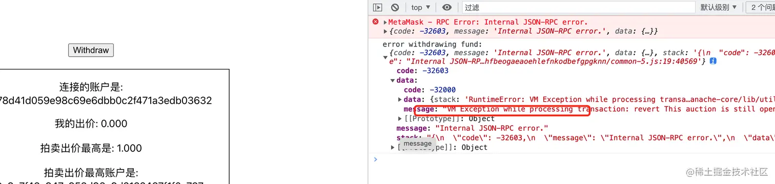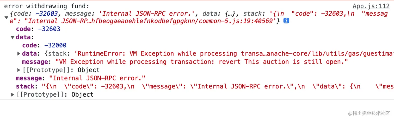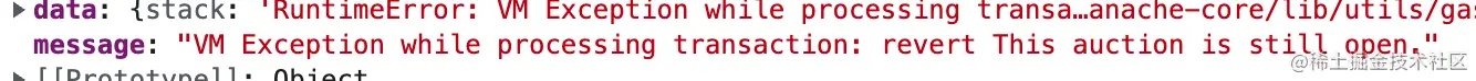 我们去合约代码Auction.sol里边查看,发现是函数装饰器抛出的错误,因为我们在endTime里边设置的拍卖时间是12个小时,所以这里还在拍卖中,所以房主不能结束拍卖。