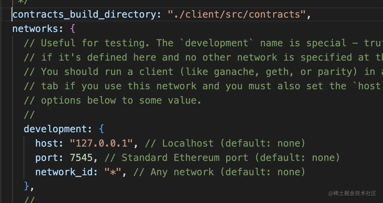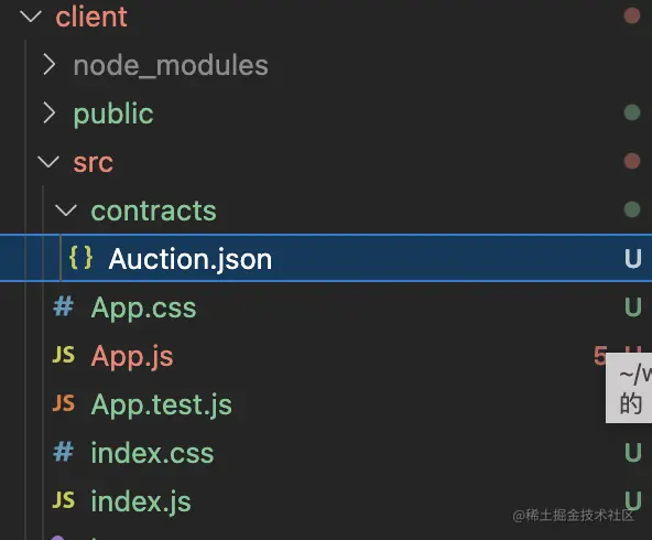 我们需要把contract address,复制到前端代码的这里替换 在client/src/app.js