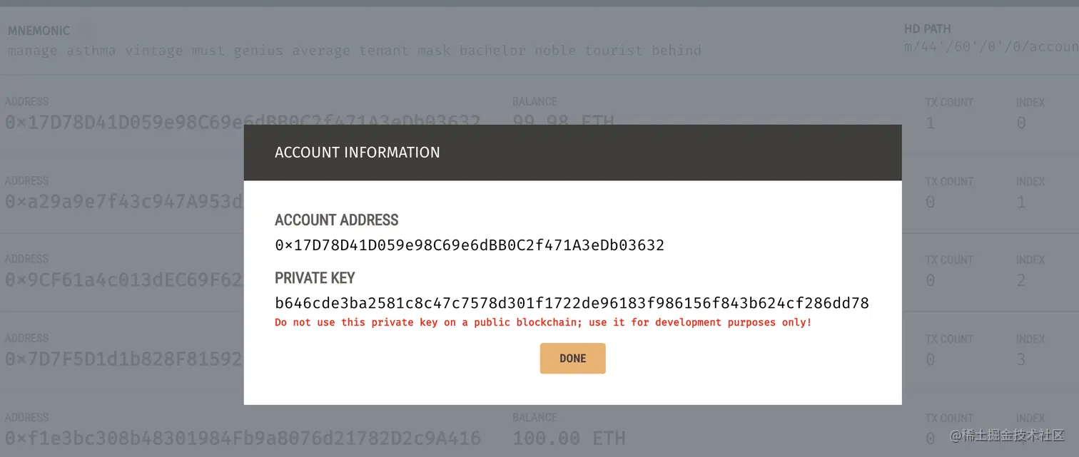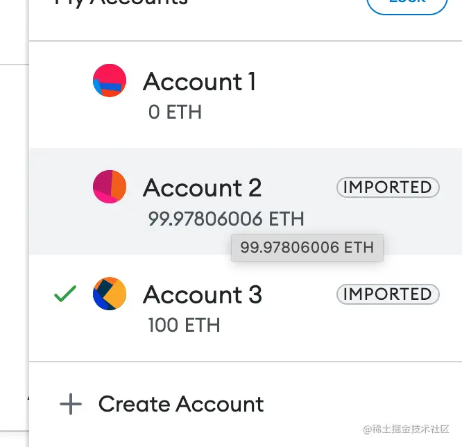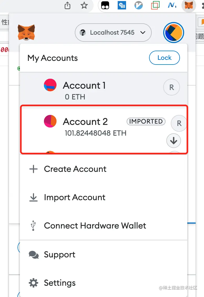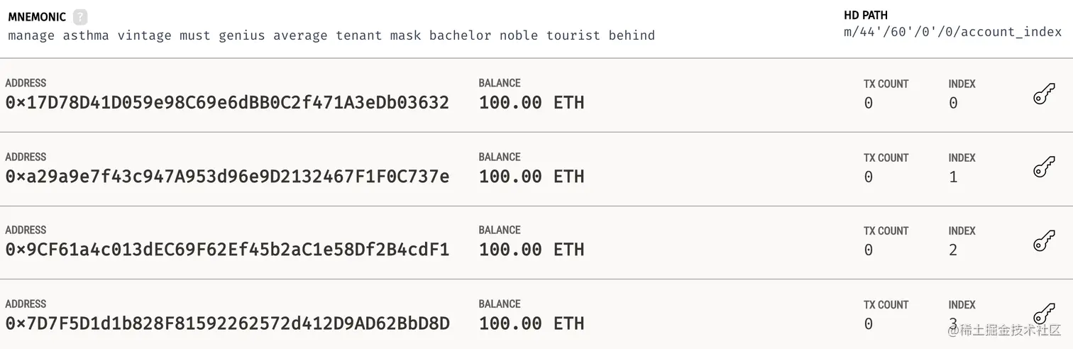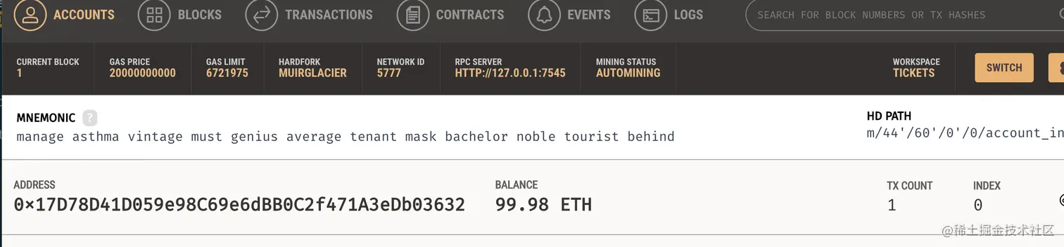 在Ganache中查看账号,通过私钥导入账号,这里我们导入两个账号