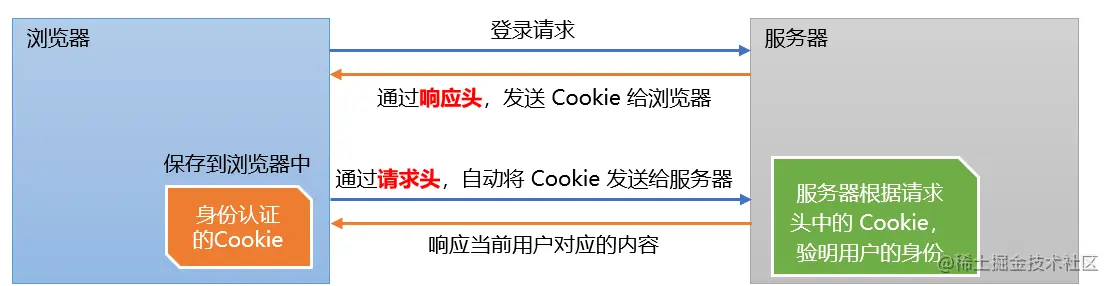 随后, 每当客户端浏览器再次发起请求时, 浏览器会自动将身份认证相关的Cookie , 通过请求头的形式发送给服务器 , 服务器即可验证用户身份
