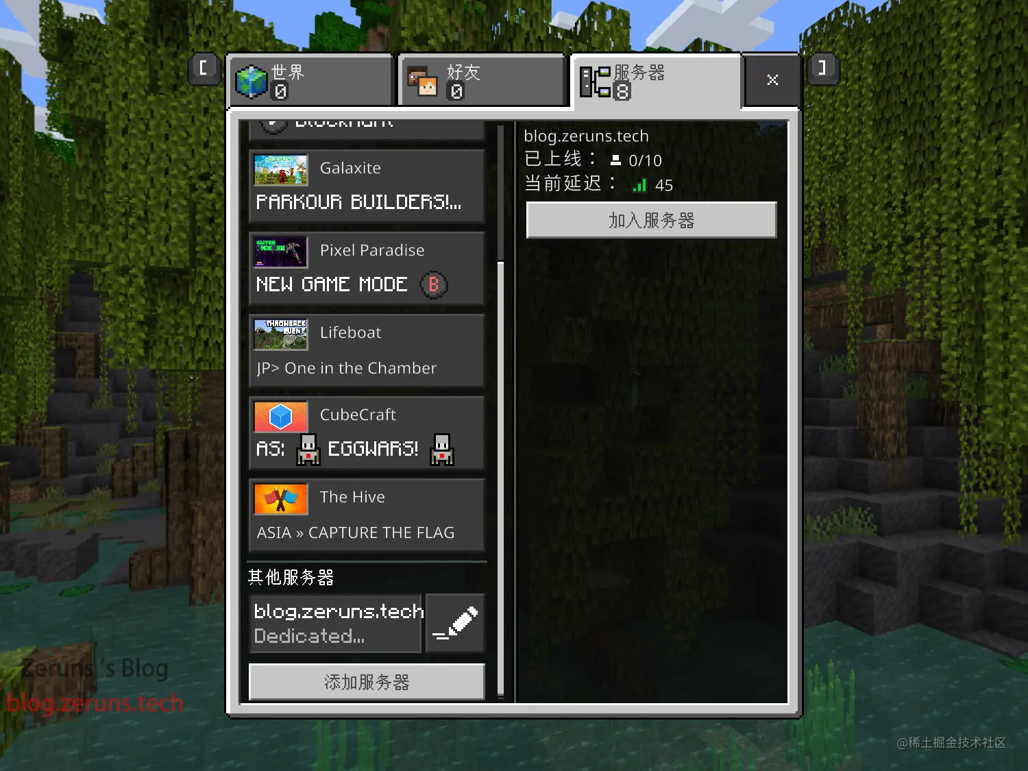 - 我的世界服务器搭建教程:blog.zeruns.tech/tag/mc/