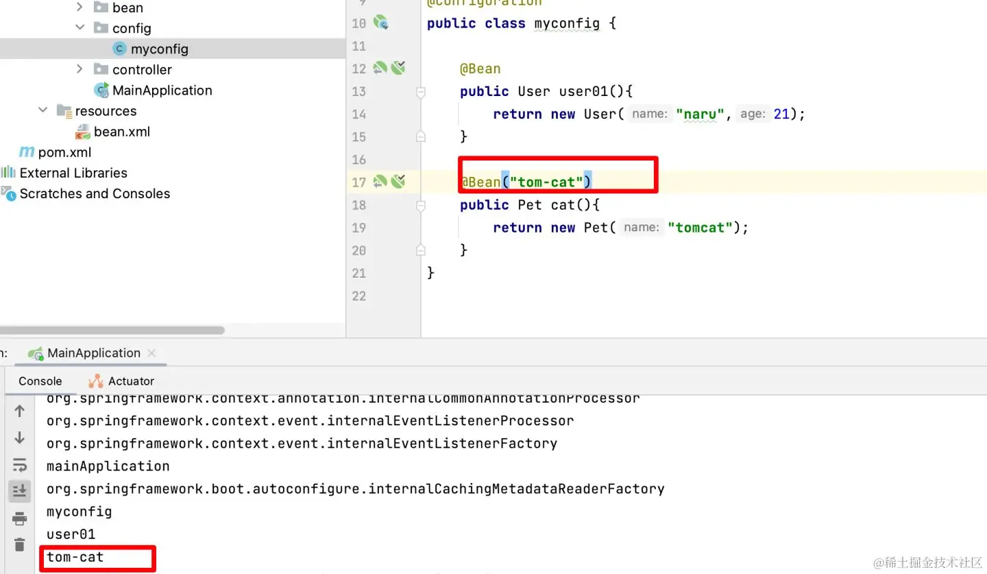 看!原来叫做 cat 的bean,现在名字变成了 tom-cat!