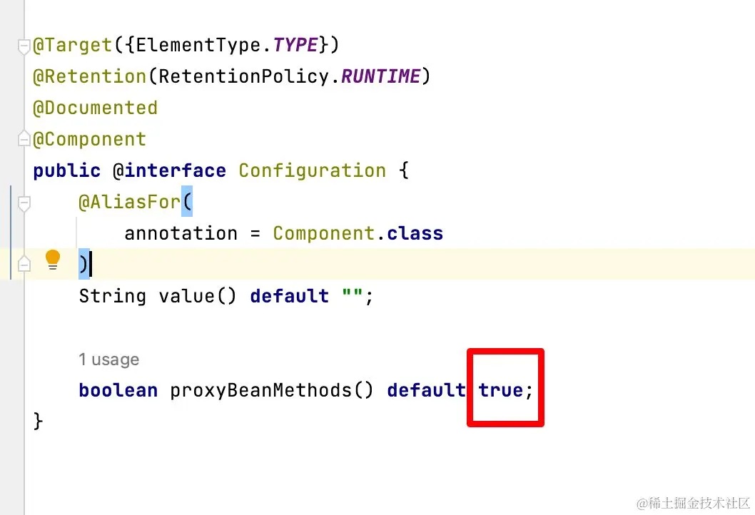 它的默认值为true。 它是干嘛用的呢? 直译过来是代理 bean 方法的意思。