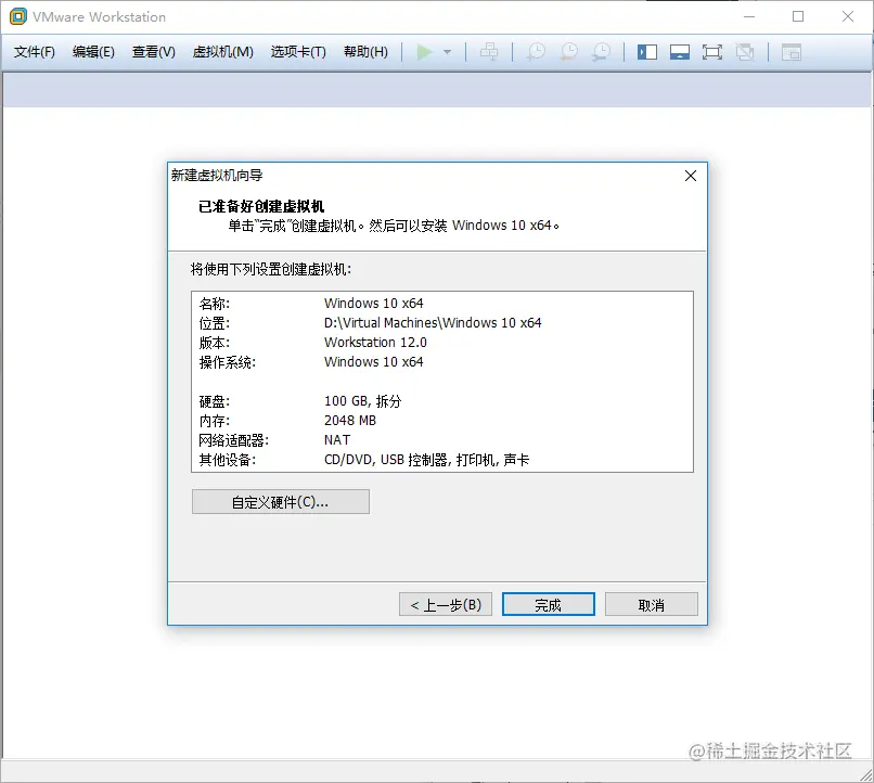 你可以点击自定义硬件,选择一下虚拟机的配置(虚拟机配置是可以随时修改的),也可以直接完成