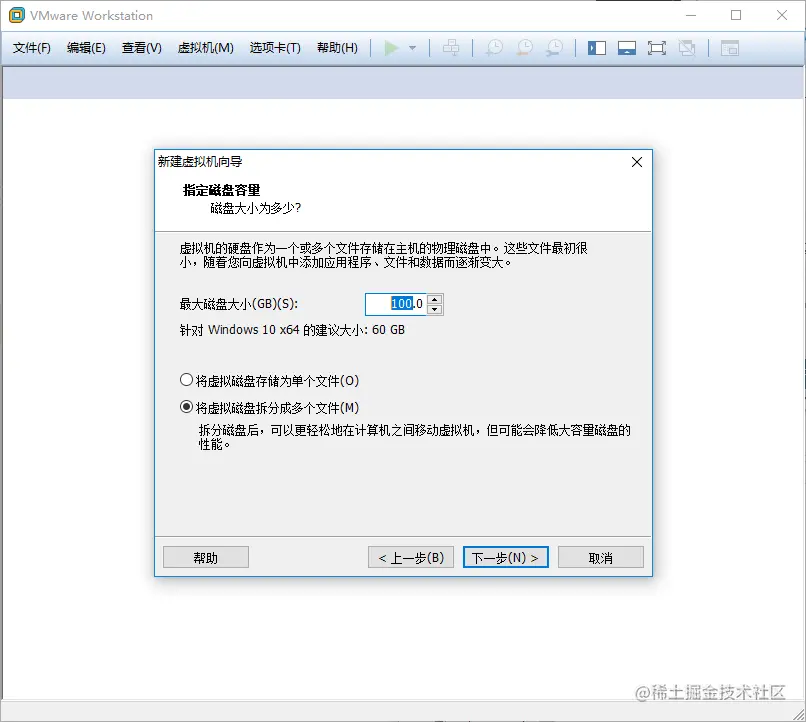 选择你虚拟机的磁盘大小,选择将虚拟磁盘拆分成多个文件,点击下一步