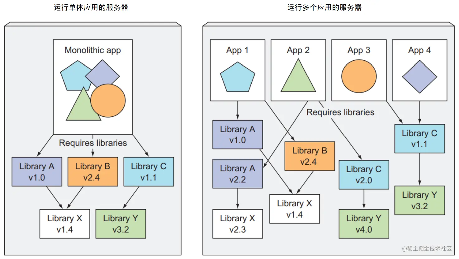 微服务中的各个组件不仅是被独立部署的,而且也是被独立开发的。由于它们的独立性,不同团队开发各自的组件是很常见的情况,每个团队都可能使用不同的依赖库并在需求变化的时候替换它们。应用程序组件之间依赖关系的差异性是不可避免的。如下图所示,部署到同一台机器上的多个应用程序会依赖同一个库的不同版本: