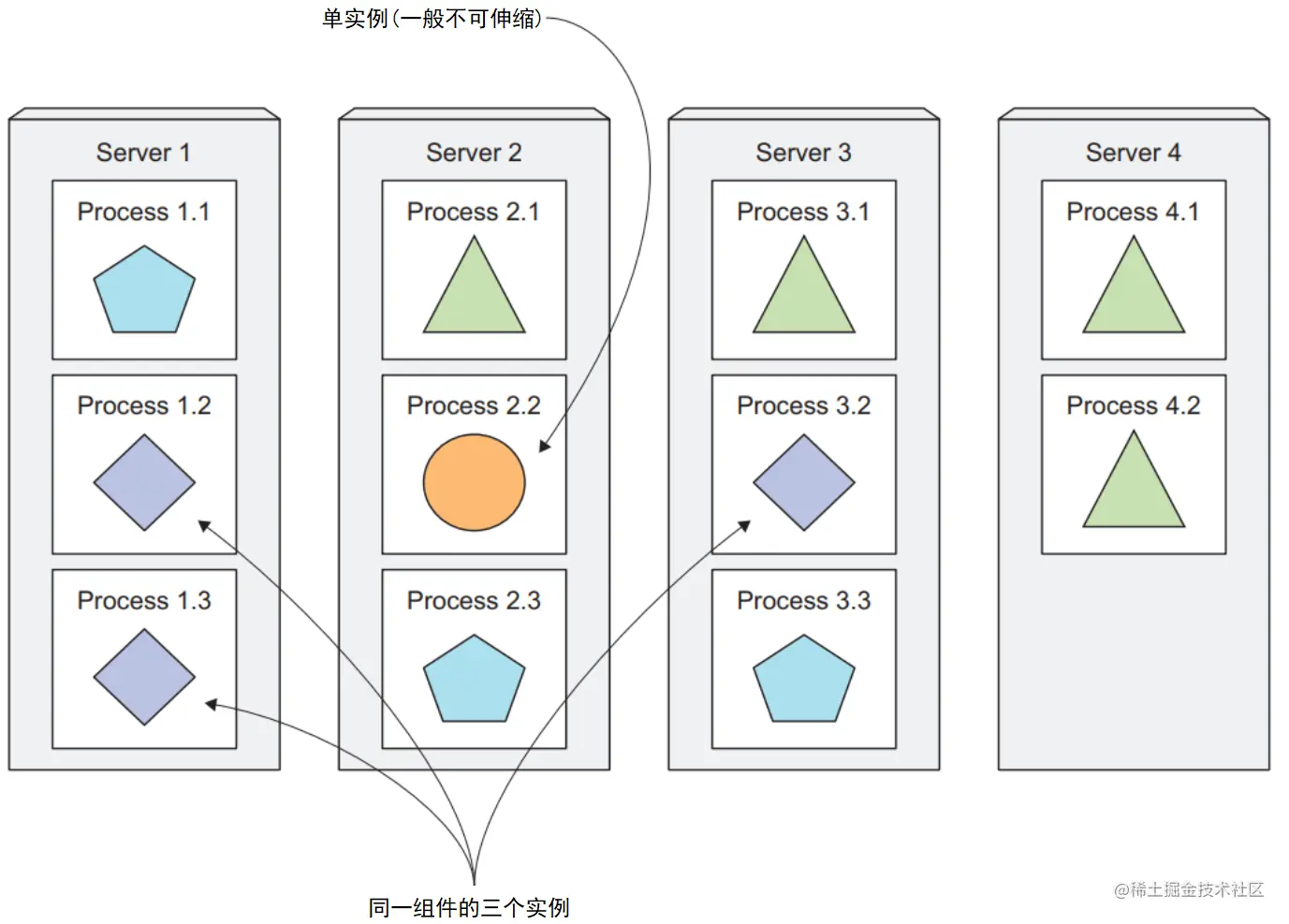 某个组件被复制出三份,并且以多进程的方式运行在不同的服务器上。而其他组件却以单个进程的方式运行。当单体应用因为其中一部分无法扩展而整体被限制扩展时,可以把应用拆分成多个微服务,将那些能进行扩展的组件进行水平扩展,不能进行扩展的组件进行垂直扩展。